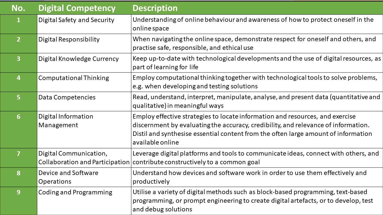 Aligning the curriculum to MOE’s 9 Digital Competencies, ensuring that students develop these essential skills through authentic learning experiences across subject areas.